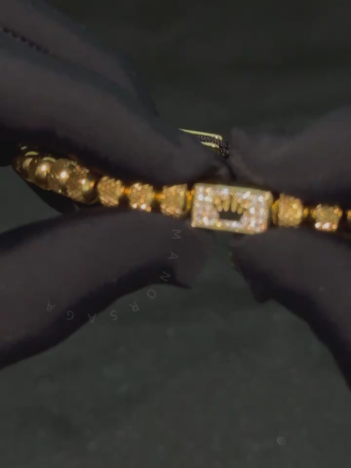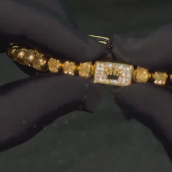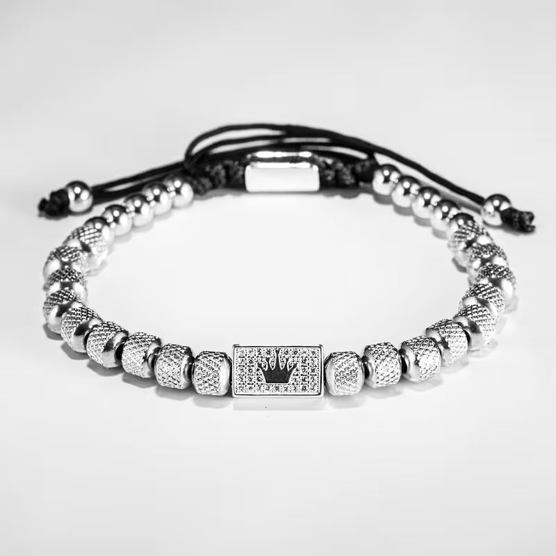 Centralny element bransoletki to misternie zdobiona kostka z motywem korony, otoczona błyszczącymi kryształami, która przyciąga wzrok i dodaje królewskiego charakteru. Fasetowane koraliki, idealnie wypolerowane, pięknie odbijają światło, tworząc hipnotyzujący efekt.