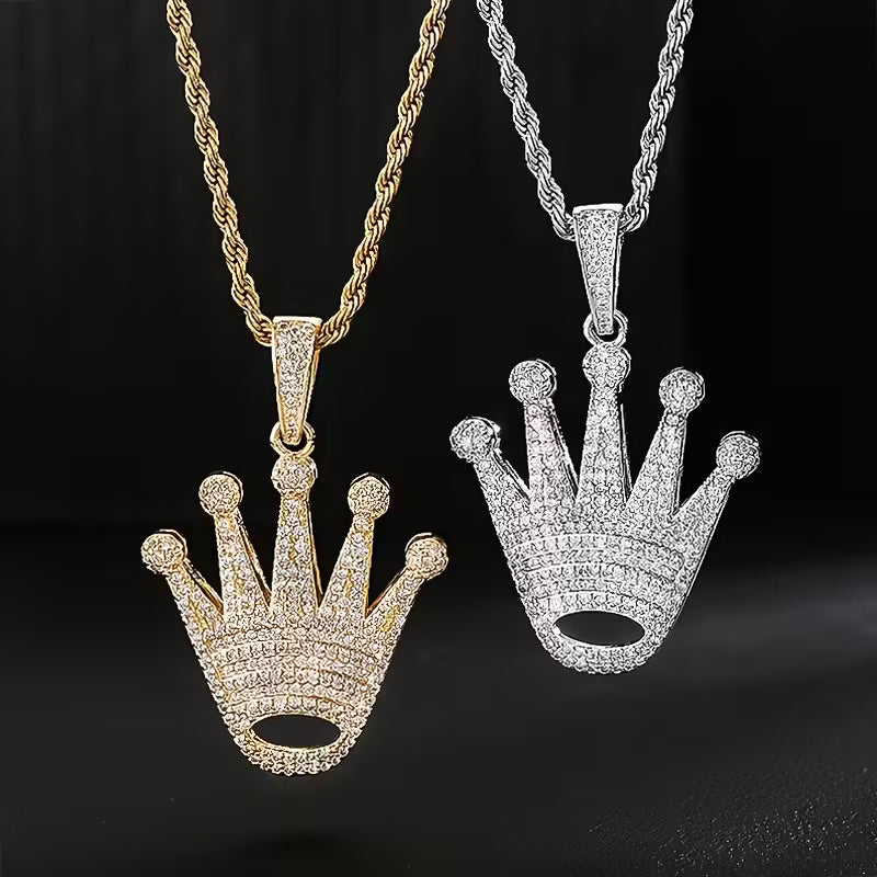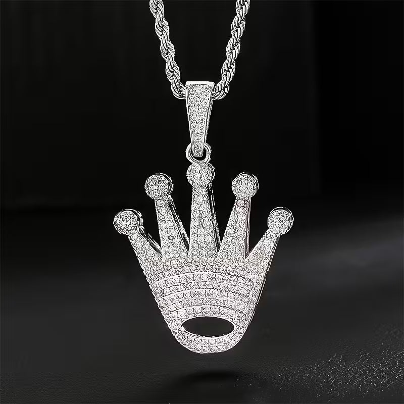 Niezrównana Jakość i Blask: Zarówno łańcuszek, jak i imponująca zawieszka, zostały wykonane z najwyższej jakości stali szlachetnej – materiału, który jest synonimem trwałości i odporności na czynniki zewnętrzne. Korona jest gęsto wysadzana lśniącymi kryształami (cyrkoniami), tworząc intensywny efekt "iced out", który olśniewa przy każdym ruchu. Stal szlachetna gwarantuje, że biżuteria nie ulegnie korozji, nie straci blasku i jest w pełni hipoalergiczna.
