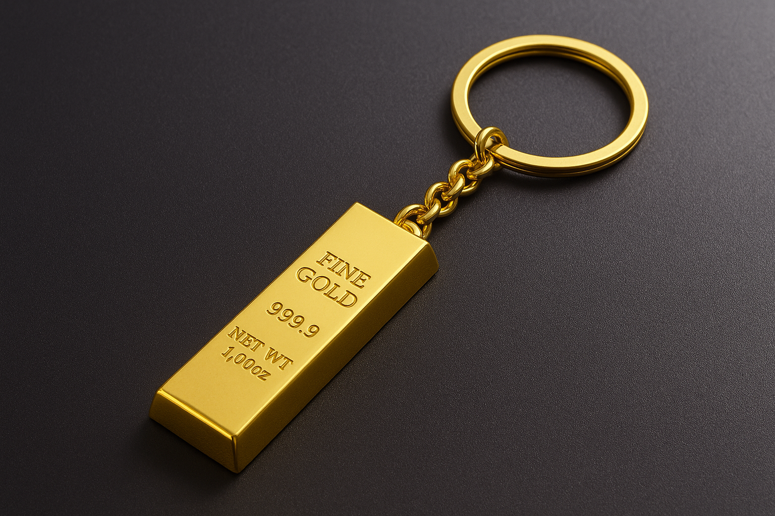 Design: Miniaturowa replika sztabki czystego złota (oznaczenia "FINE GOLD 999.9" i "NET WT 1.00oz").